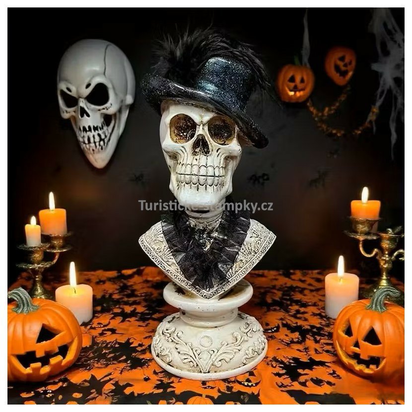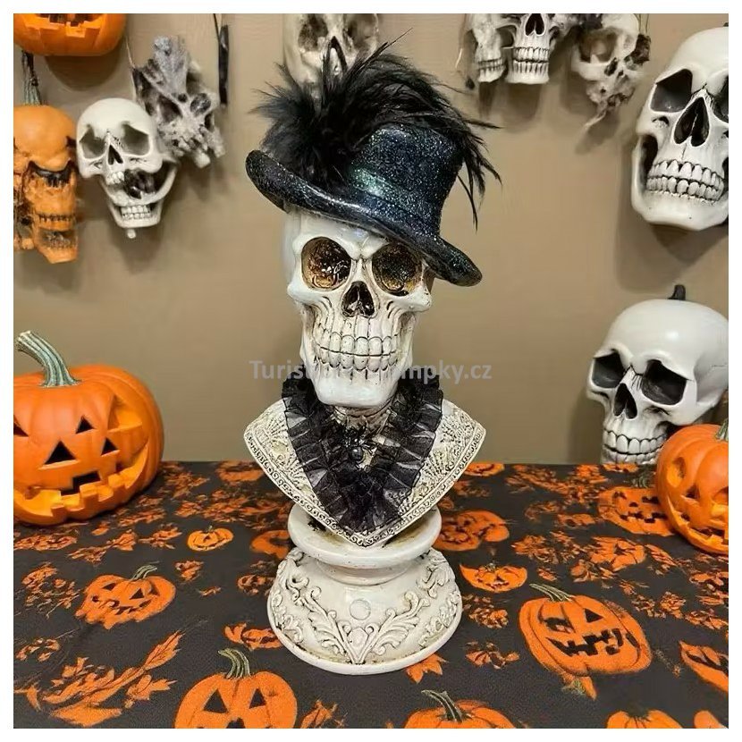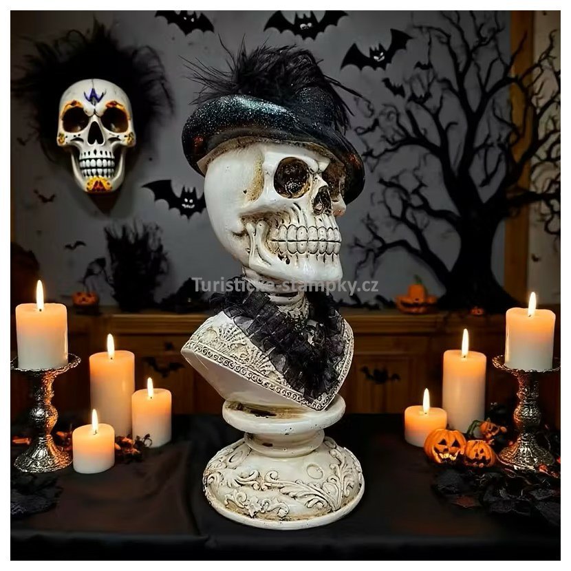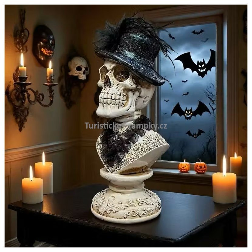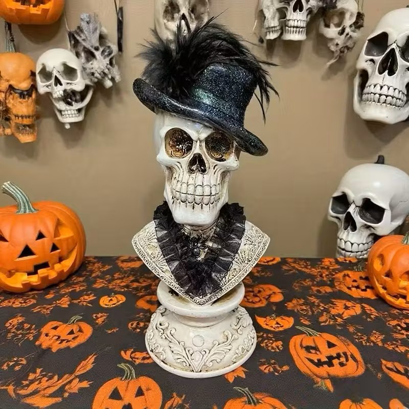 Busta lebky hlavy z pryskyřice. Gotický Viktoriánský gentleman - elegantní klobouk s černým peřím, ozdobný límec a řetízkový náhrdelník - detailní design obličejových kostí s texturou
