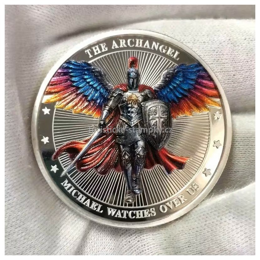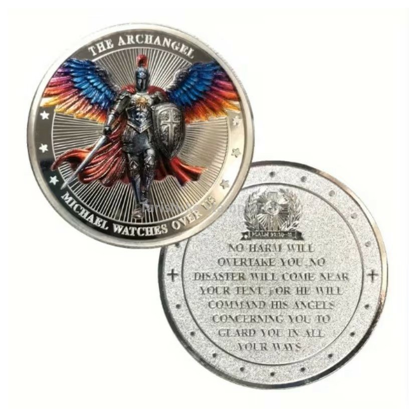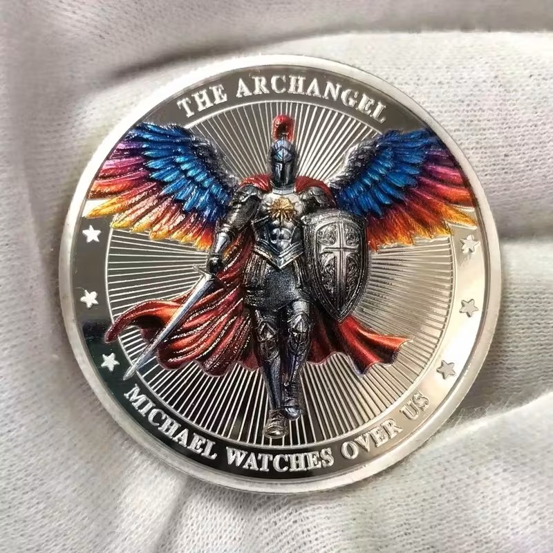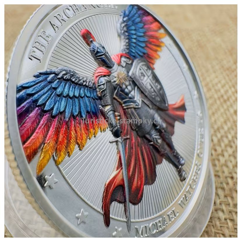 Pamětní mince s motivem Archanděla Michaela. Na přední straně je vyobrazen Archanděl Michael v plné zbroji s mečem a štítem, s barevnými křídly.