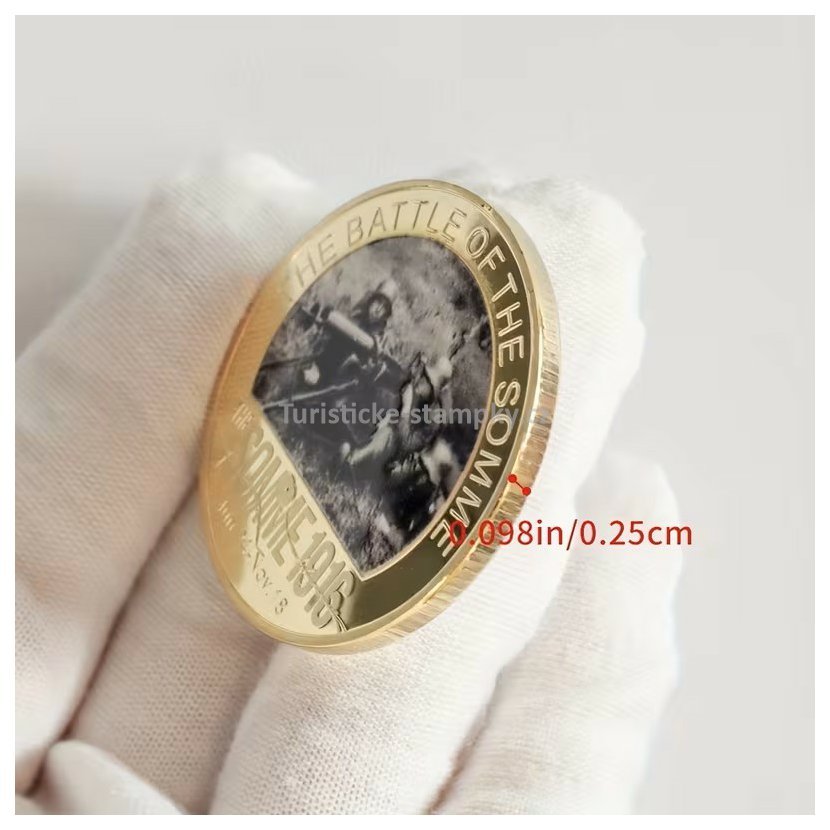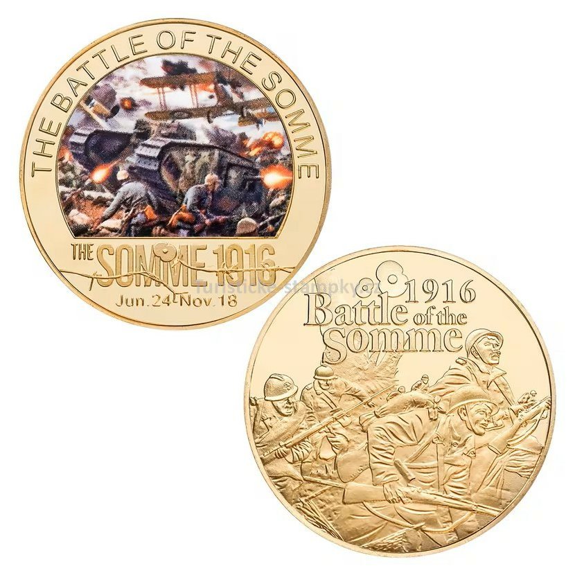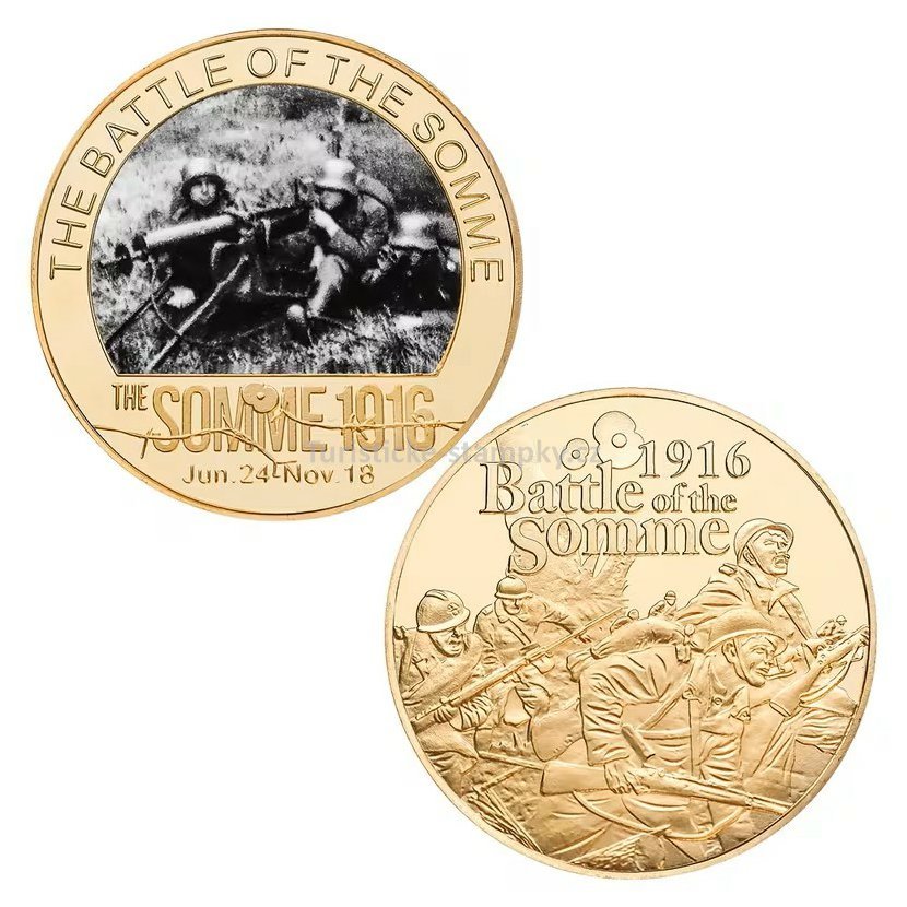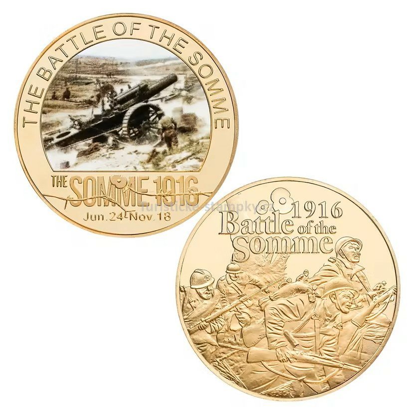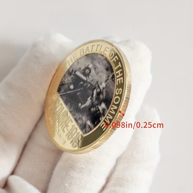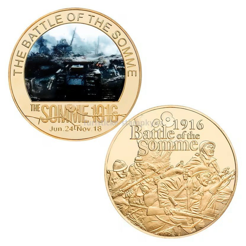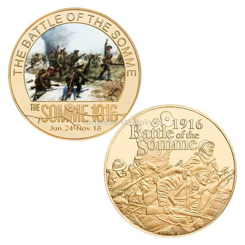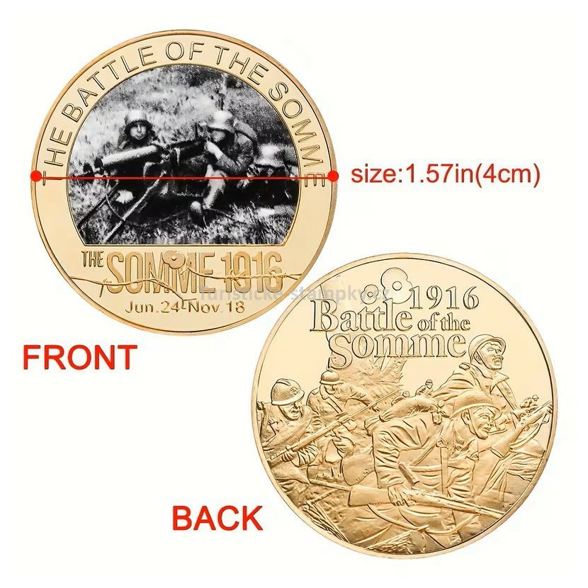 • Na druhé straně je reliéf vojáků v akci a nápis "1916 Battle of the Somme".
