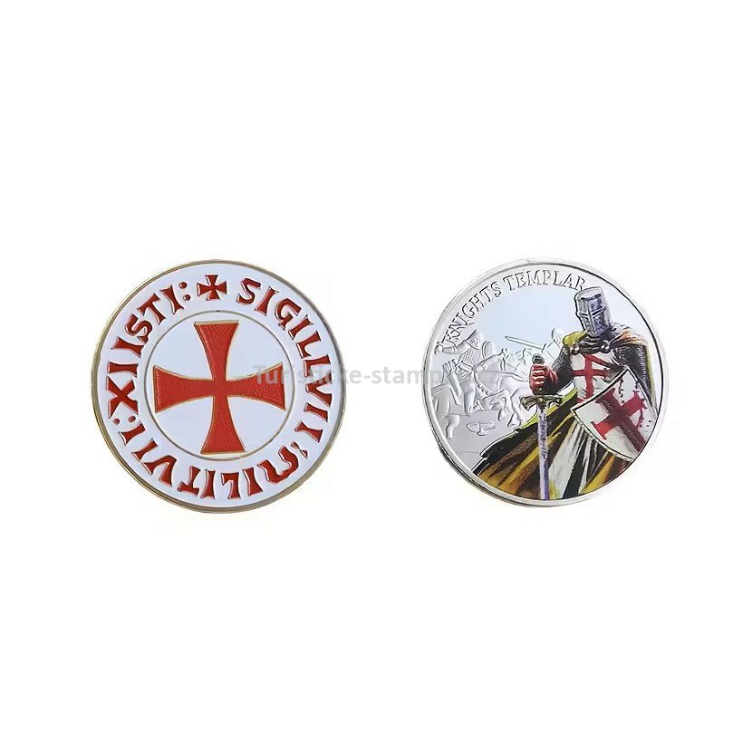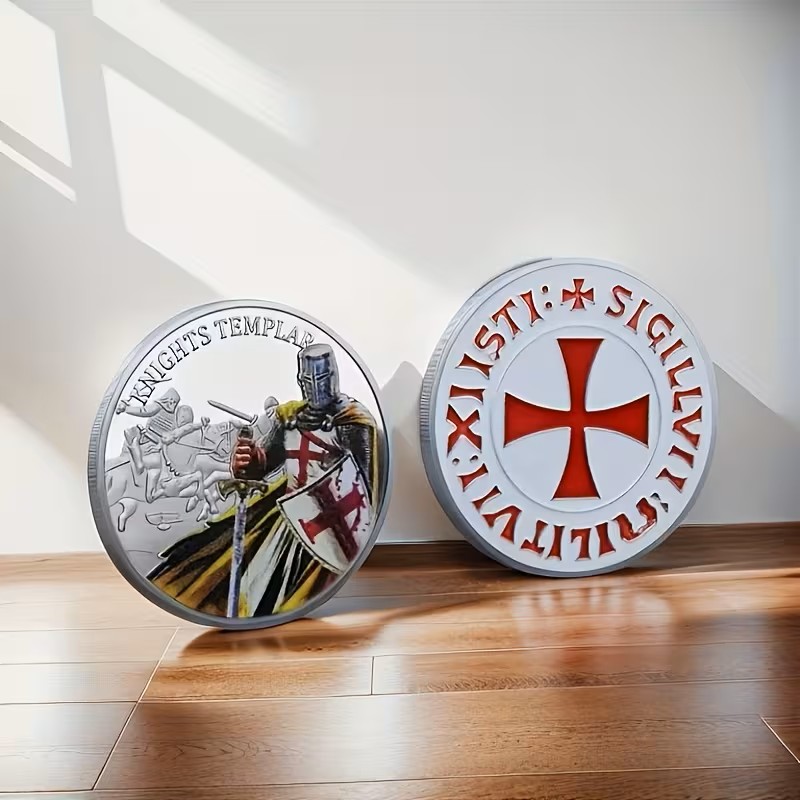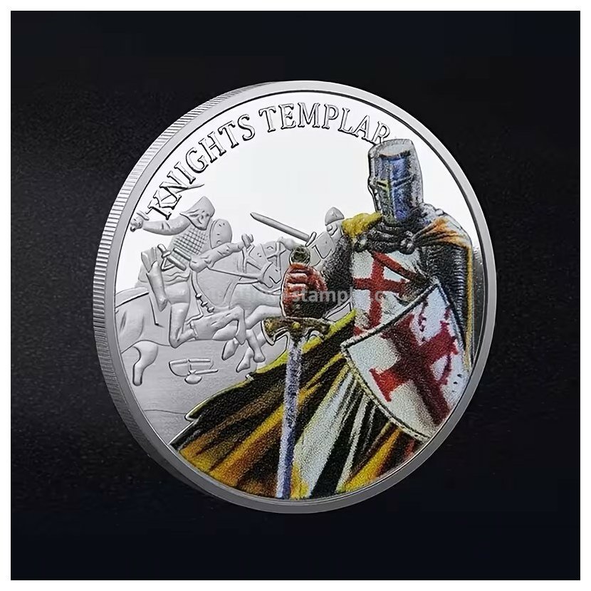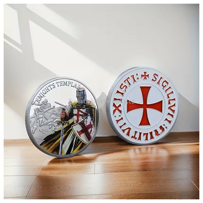 Sběratelská mince (challenge coin) s motivem templářského rytíře o průměru 40 mm. Vyrobeno z vysoce kvalitního kovu. Na jedné straně je vyobrazen rytíř v brnění se štítem a mečem, na druhé straně je kříž a nápisy s hesly templářů. Symbolizuje víru, odvahu, čest a integritu.