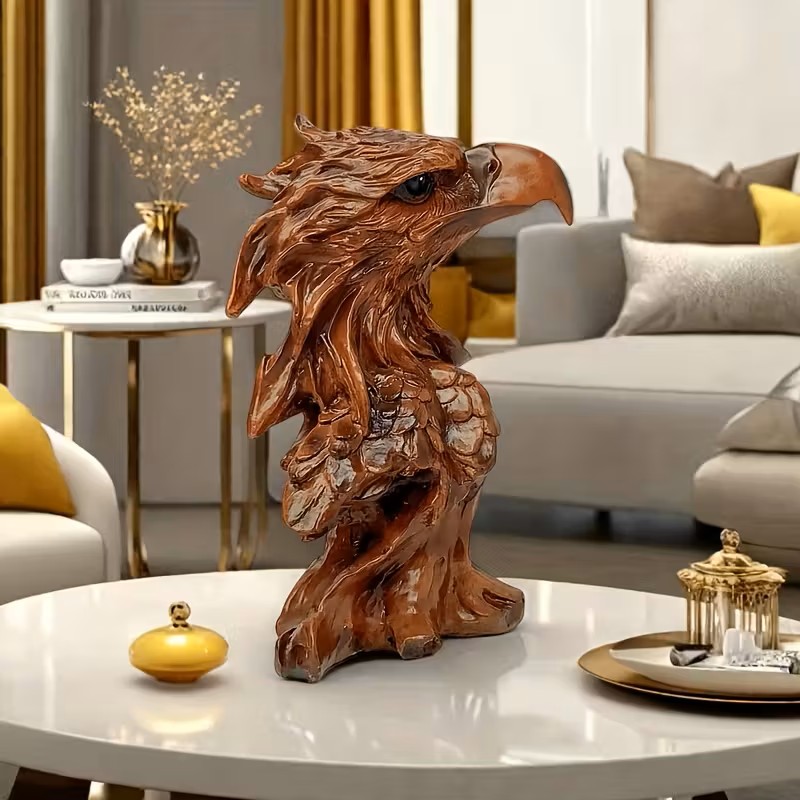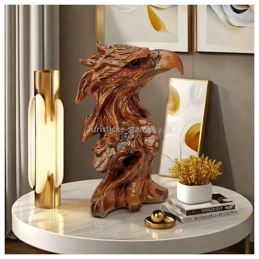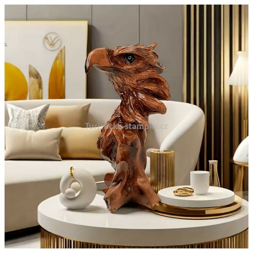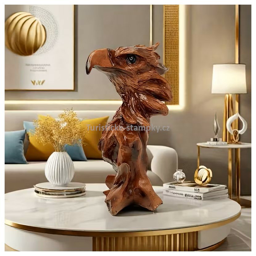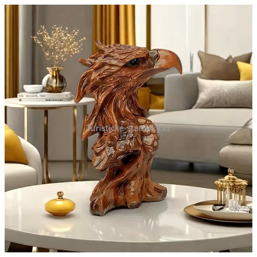 Socha orlí hlavy z pryskyřice s texturou - realistická dekorace v barvě dřeva